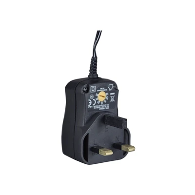 Plug-in regulated power supply with 3-12 V DC switchable output. LED indicator and selectable polarity. Comes complete with 6 DC adaptor plugs. Features include, IC regulated DC output, short circuit protection and automatic overload cut off.